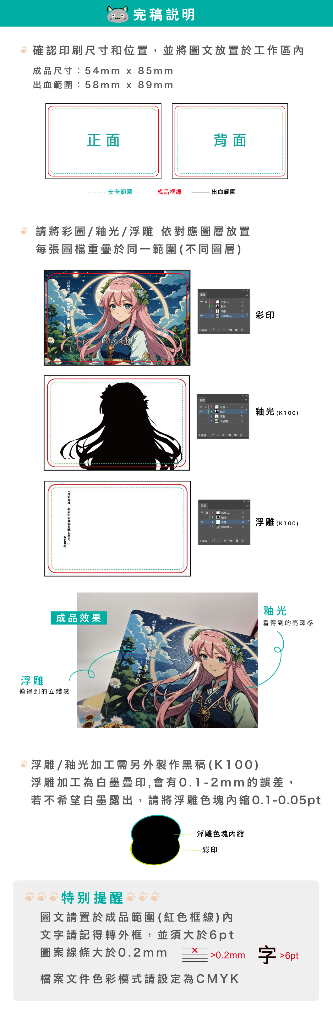 推薦選擇:預設採用 UV數位彩印;若想要更強烈的層次與光澤,建議加購 局部水晶釉光 或 立體浮雕,打造專屬的高辨識度卡面。