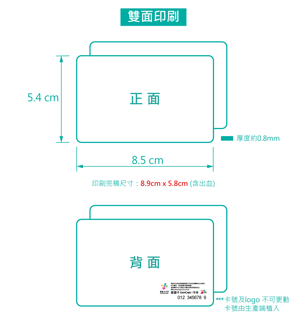 單一卡片尺寸:85×54mm;建議出血89×58mm;厚度0.7~0.8mm,常見卡套相容。